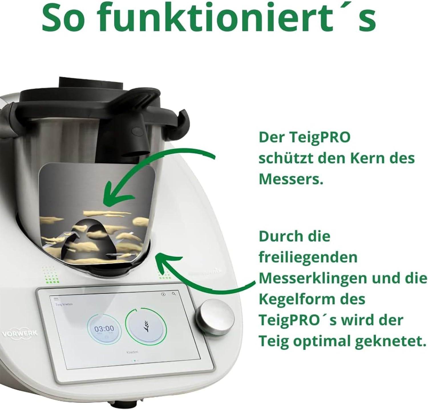 Już nigdy nie będziesz musiał czyścić noży z ciasta po jego zagniataniu w Thermomixie! Osłona uniemożliwia przyklejanie ciasta do noży, ponieważ noże są zamknięte w obudowie unikalnej, co zapobiega kontaktowi ciasta z nożami.