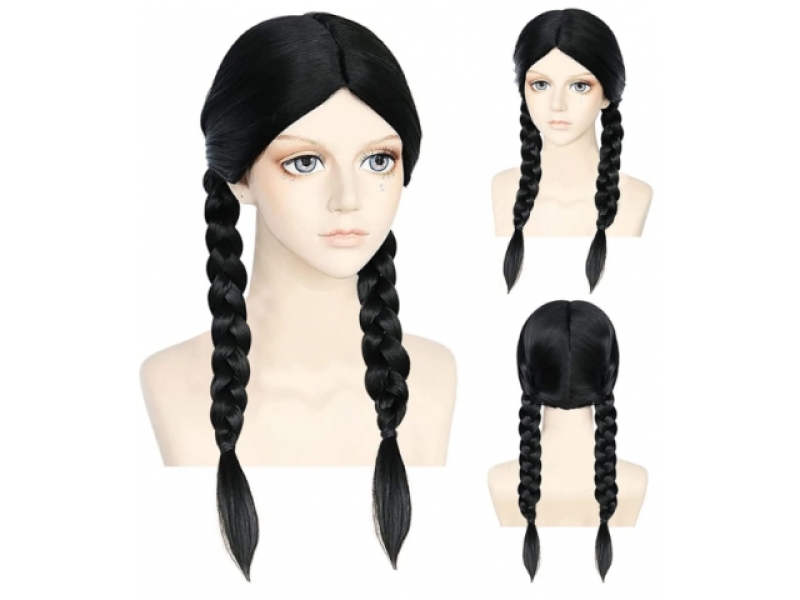 Sztuczna peruka w kolorze czarnym z warkoczami to ikoniczna peruka inspirowana główną postacią Wednesday.