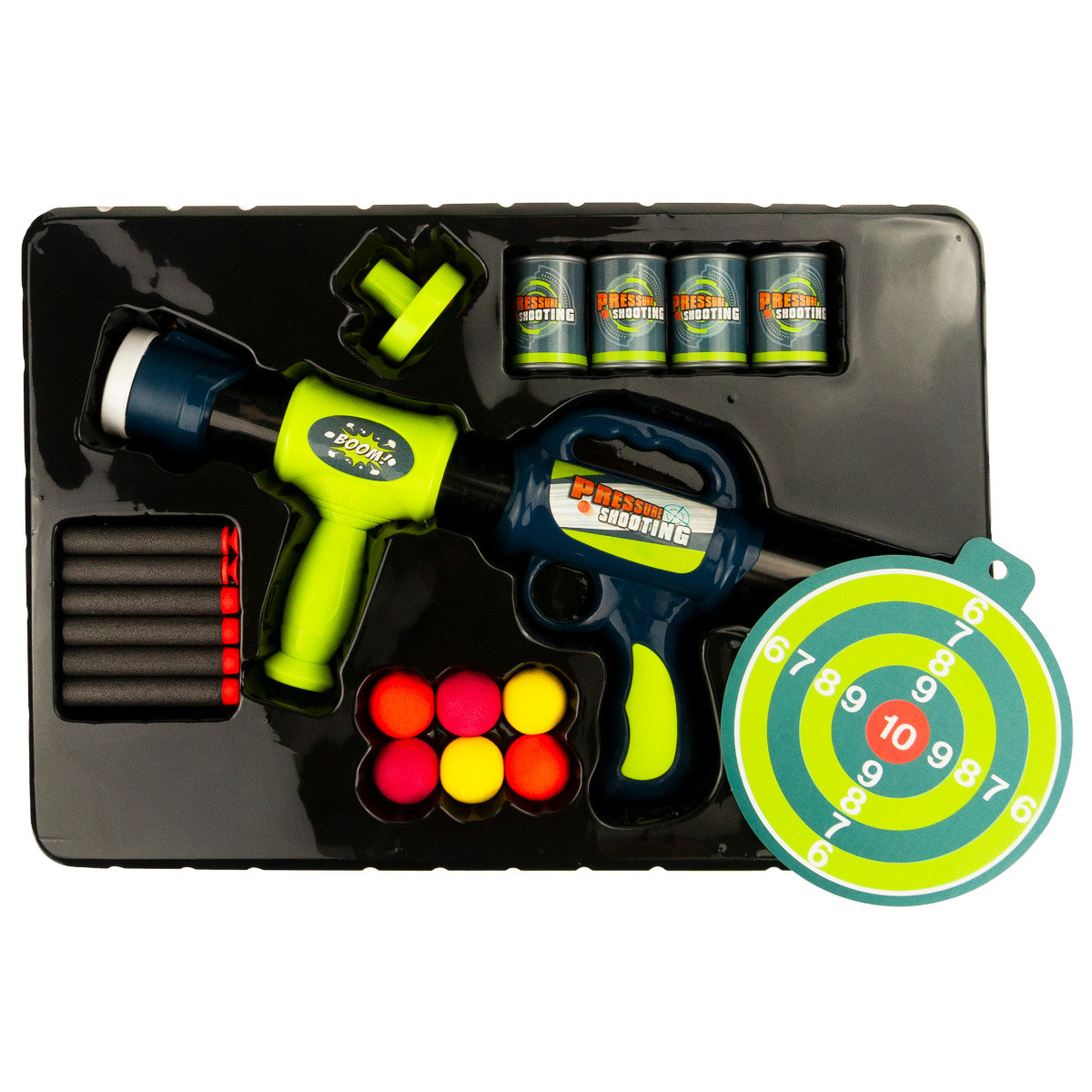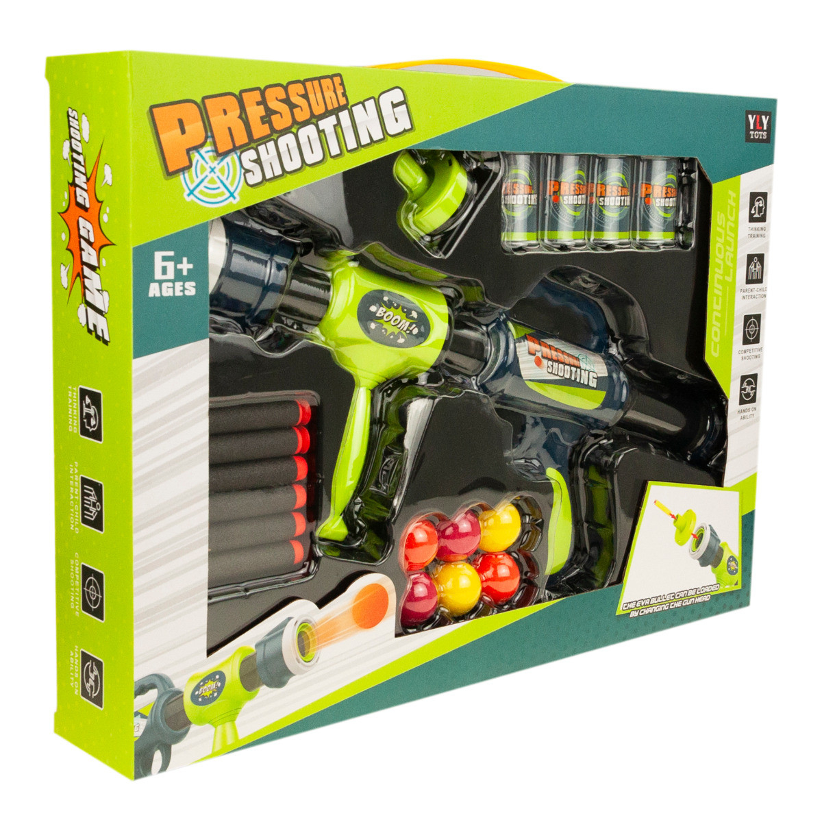 - Zawartość opakowania: pistolet, 6 piankowych nabojów, 6 kulek, 4 puszki, tarcza.