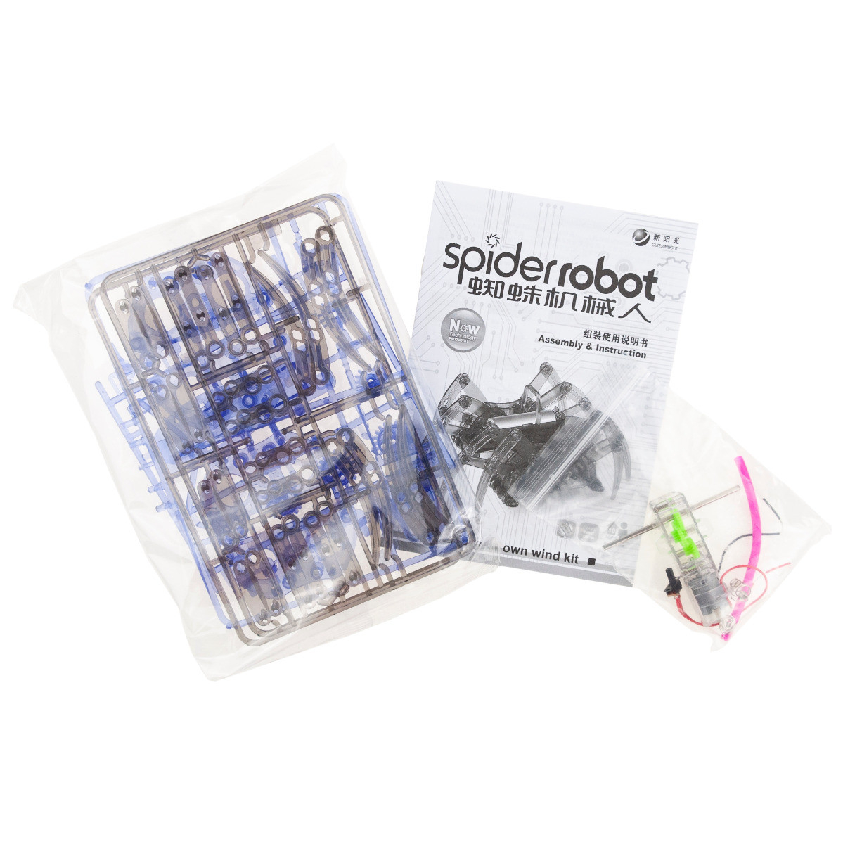 Aby pająk działał, potrzebna jest jedna bateria AA 1,5 V. Poszczególne części zestawu składa się poprzez zatrzaskiwanie. Osiem skrzyżowanych nóg pająka imituje jego pełzanie.
