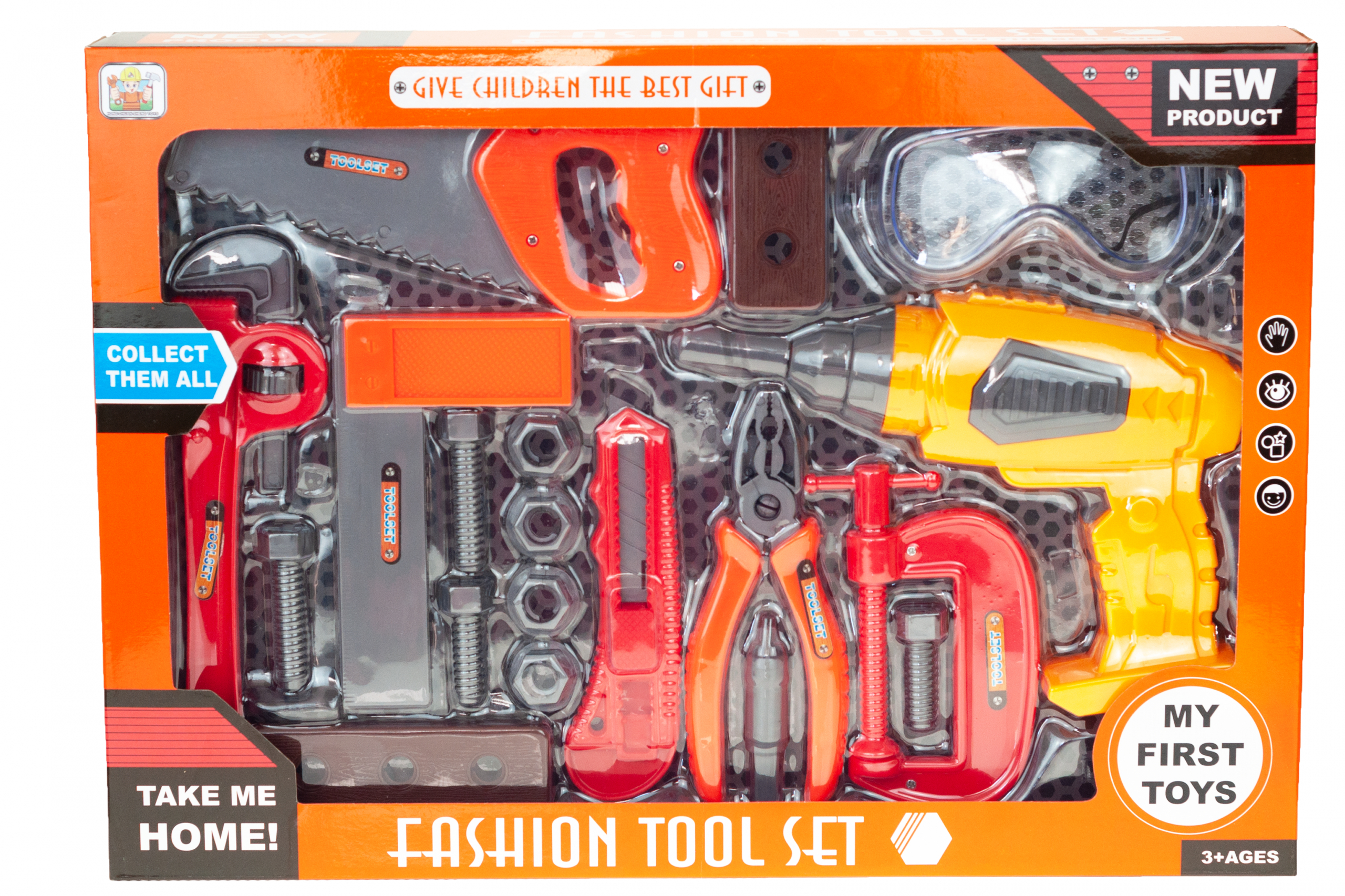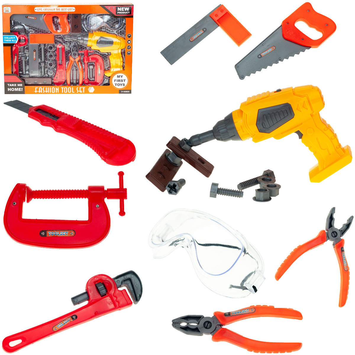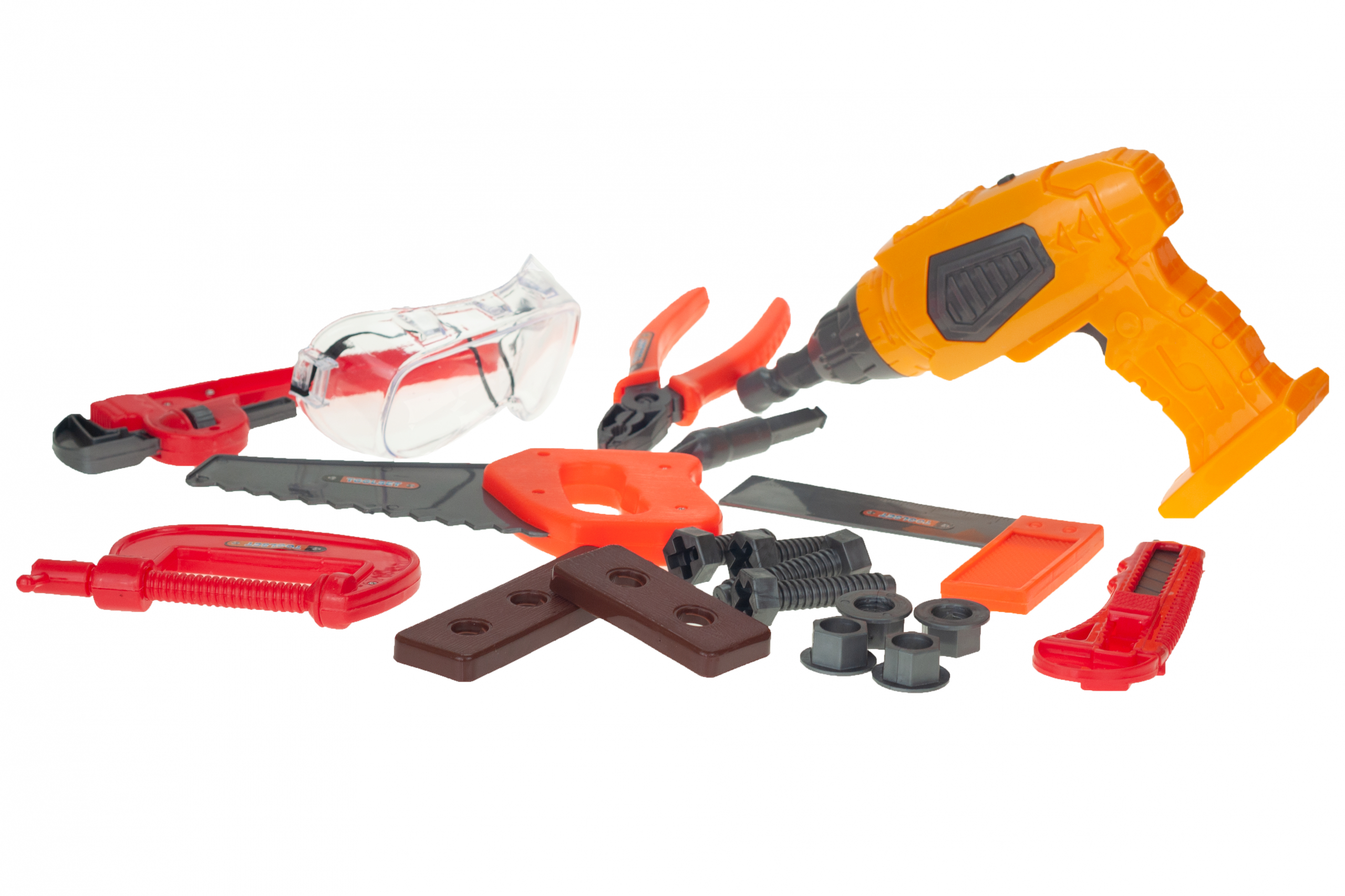 Ten wspaniały zestaw zawiera pomysłowo wykonane i precyzyjnie opracowane narzędzia, które są całkowicie wykonane z plastiku. Każdy mały majsterkowicz powinien mieć takie narzędzia, aby mógł stać się pomocnikiem taty lub dziadka i szybko naprawić każdą usterkę. Zestaw zapewni niejednemu małemu pomocnikowi wspaniałą i przede wszystkim bezpieczną zabawę, bez konieczności brania narzędzi od taty. Funkcjonująca wiertarka pracuje jak prawdziwa, posiada funkcję obrotu w prawo i w lewo. Zasilana 3 bateriami AA (nie są dołączone do zestawu).
