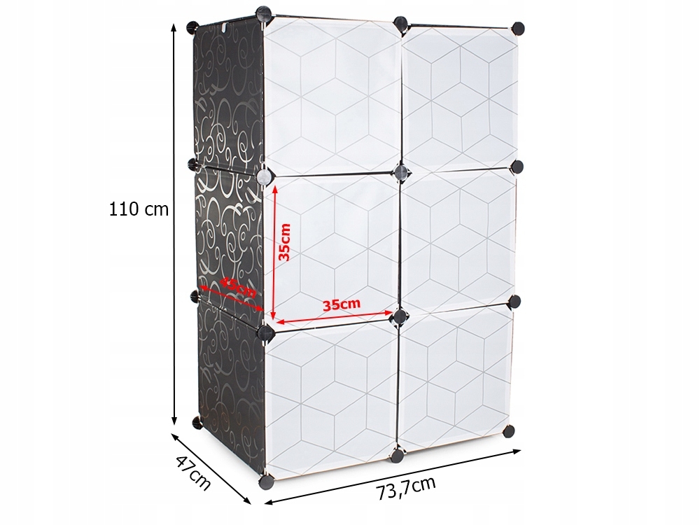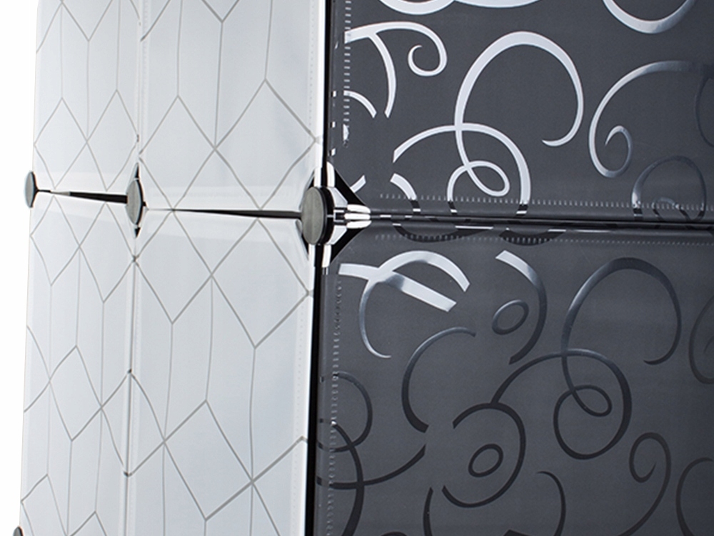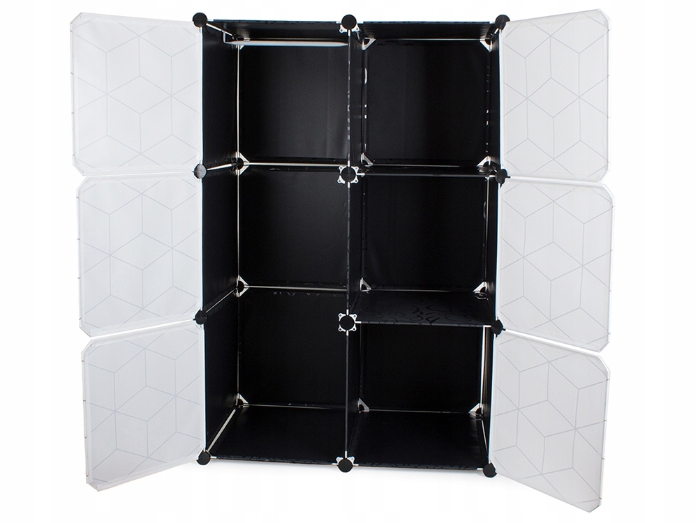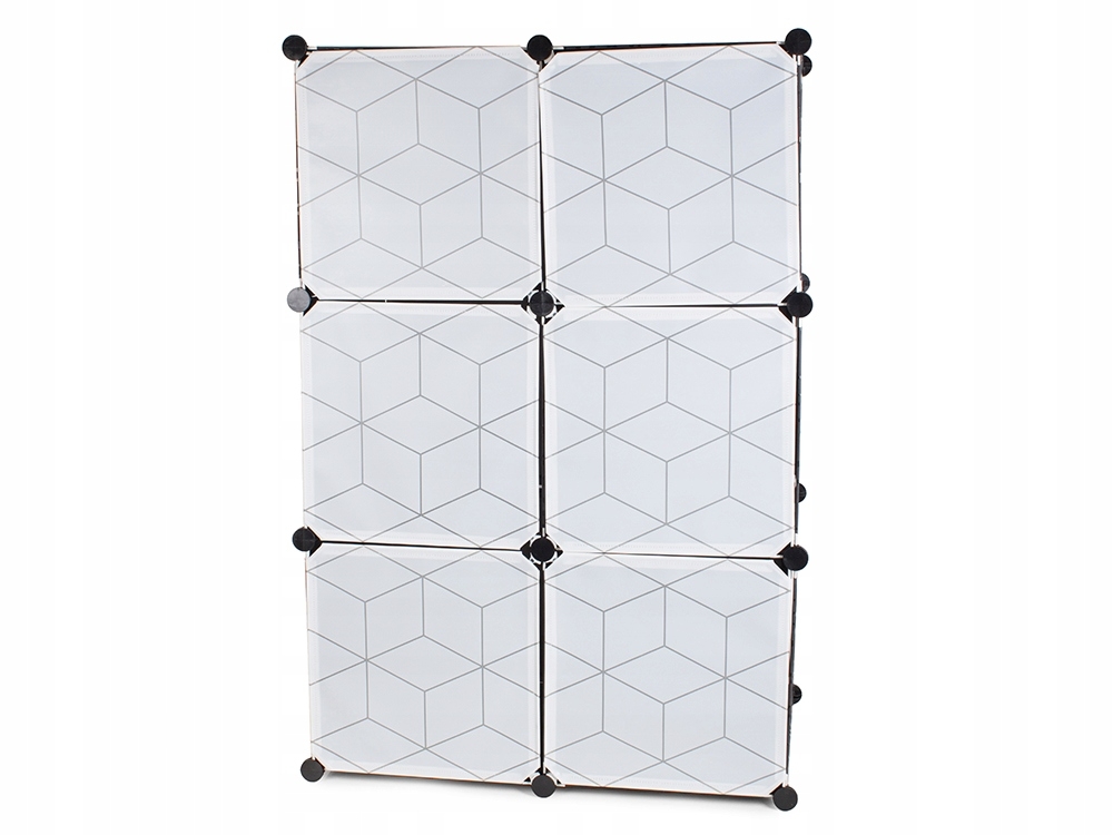 Modułowa szafa świetnie nadaje się do garderoby lub przedpokoju. Dobrze będzie wyglądać również w firmie lub biurze. Szafa ma dodatkowo bardzo estetyczny design z ładnym wzorem, dzięki czemu doskonale pasuje do wystroju każdego domu. Ma 6 segmentów, które można łączyć i układać oraz umieszczać obok siebie w zależności od potrzeb i przestrzeni dostępnej. Jedną część szafy można użyć na powieszenie ubrań, ponieważ została wyposażona w drążek na wieszaki. Jest także lekka i stabilna.
