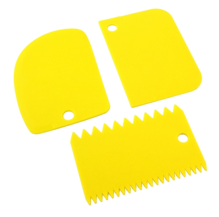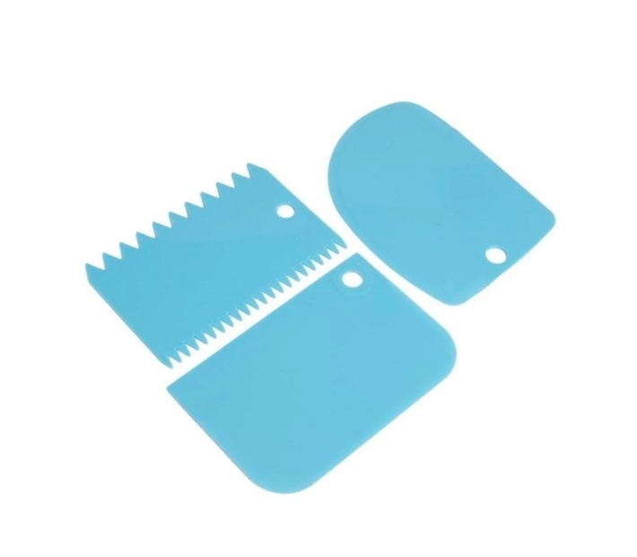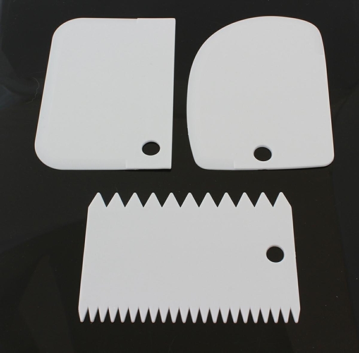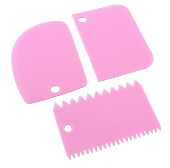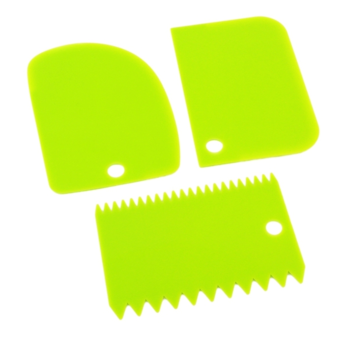 Zestaw 3 łopatek stierki do krojenia tortów i ciast. Świetnie nadają się również do dekoracji słodyczy. Różne kształty noży ułatwiają pracę. Wykonane z solidnego plastiku, który zapewnia długotrwałe użytkowanie.