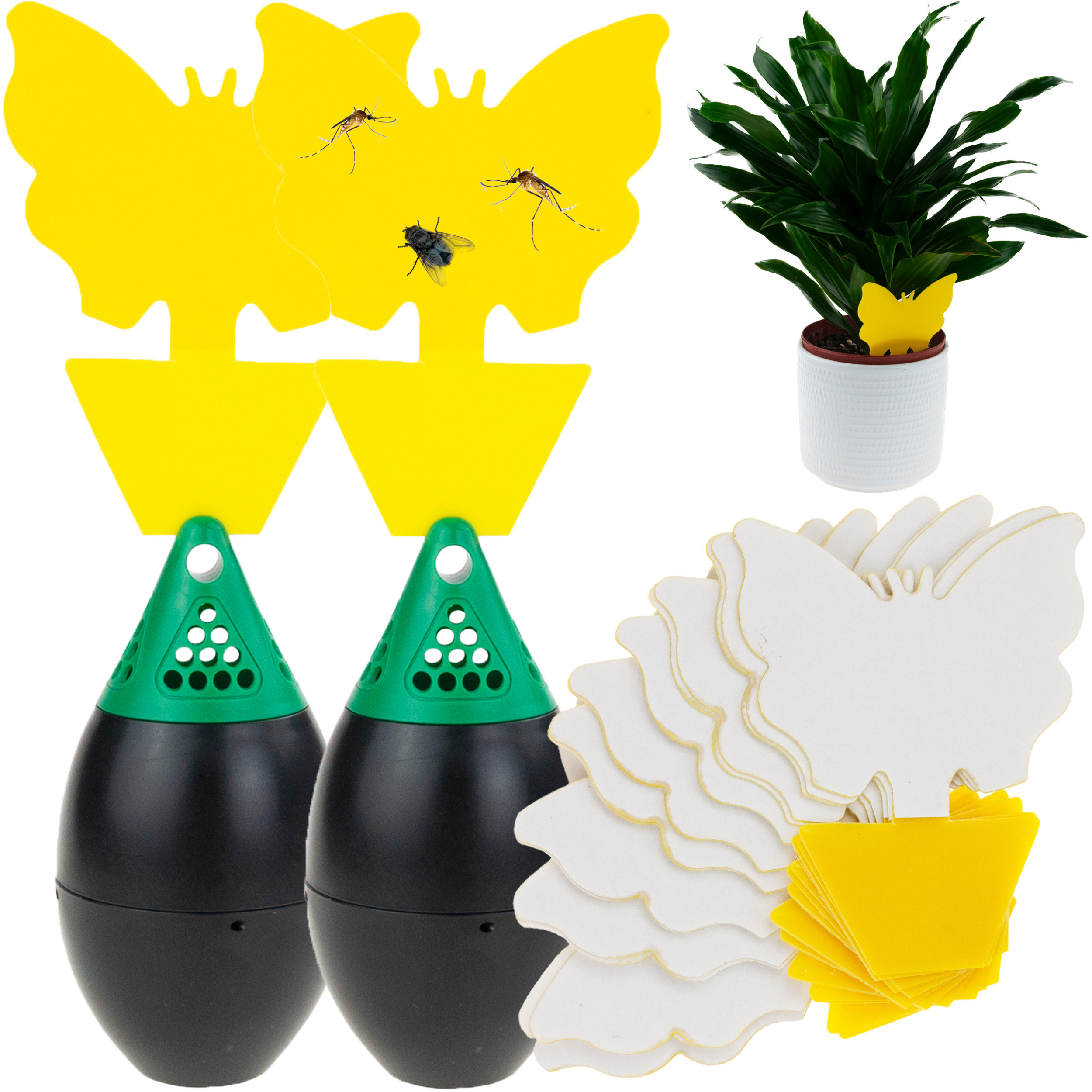 - Zestaw zawiera: 2 pułapki plastikowe, 20 dwustronnych lepowych pułapek