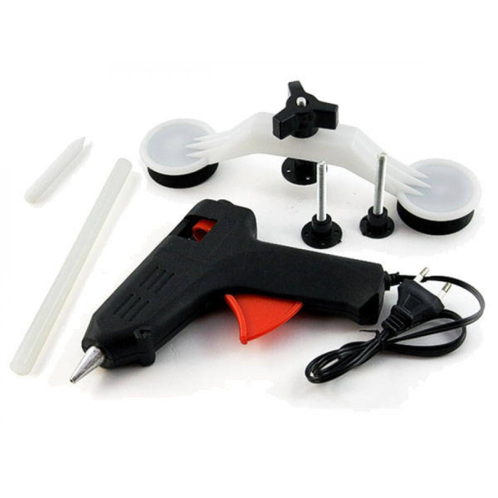 Zestaw zawiera: Zestaw Pops a Dent do naprawy wgnieceń karoserii (1x pistolet do kleju, 1x podstawa, 1x klej w pręciku, 3x nasadki przytrzymujące, 1x plastikowa dźwignia, 1x pręt do usuwania kleju, 1x instrukcja w języku angielskim)