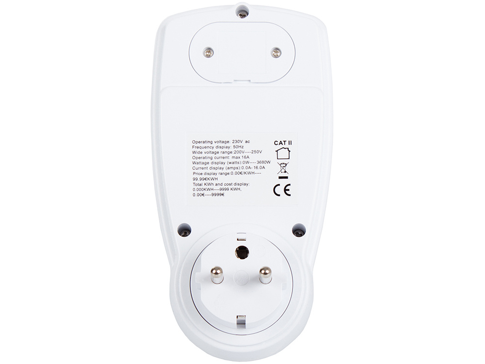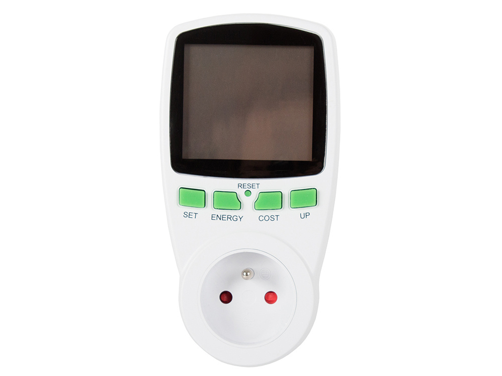 Urządzenie ma duży, przejrzysty wyświetlacz i 4 przyciski. Miernik zużycia energii pozwala monitorować poziom zużycia energii przez podłączone urządzenie. Na wyświetlaczu można wyświetlić wiele parametrów, na przykład czas pomiaru, aktualne napięcie, częstotliwość, pobór prądu itp.
