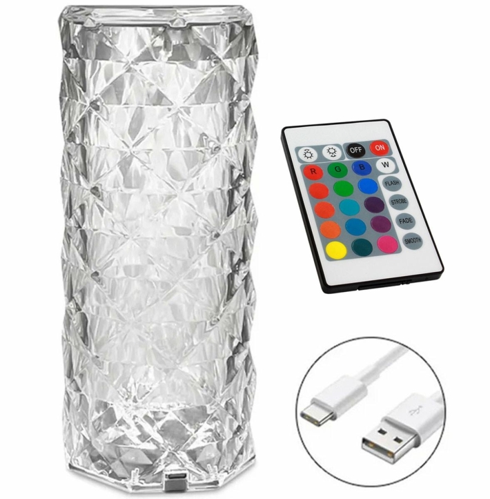 Stołowa lampa imitująca kryształ jest nie tylko praktyczną lampą, odpowiednią do umieszczenia na stole lub komodzie, ale także wspaniałym elementem dekoracyjnym w Twoim wnętrzu. Jest wyposażona w wbudowane, energooszczędne diody LED RGB. Lampa jest doskonała jako dodatkowe oświetlenie do każdego pomieszczenia, nie tylko do sypialni. Urządzenie jest zasilane wbudowaną baterią, którą można ładować za pomocą dołączonego kabla USB. W skład zestawu wchodzi również pilot zdalnego sterowania, który pozwala zmieniać intensywność światła oraz wybierać tryb i kolor światła.