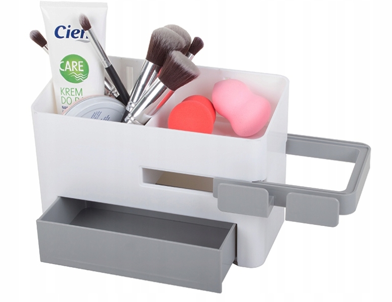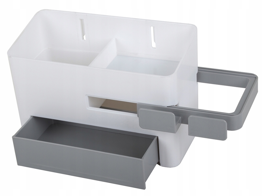 Uniwersalny organizer do łazienki to idealne rozwiązanie dla porządku w łazience. Organizer posiada pojemnik z przegrodą, szufladę i wysuwany uchwyt na suszarkę.