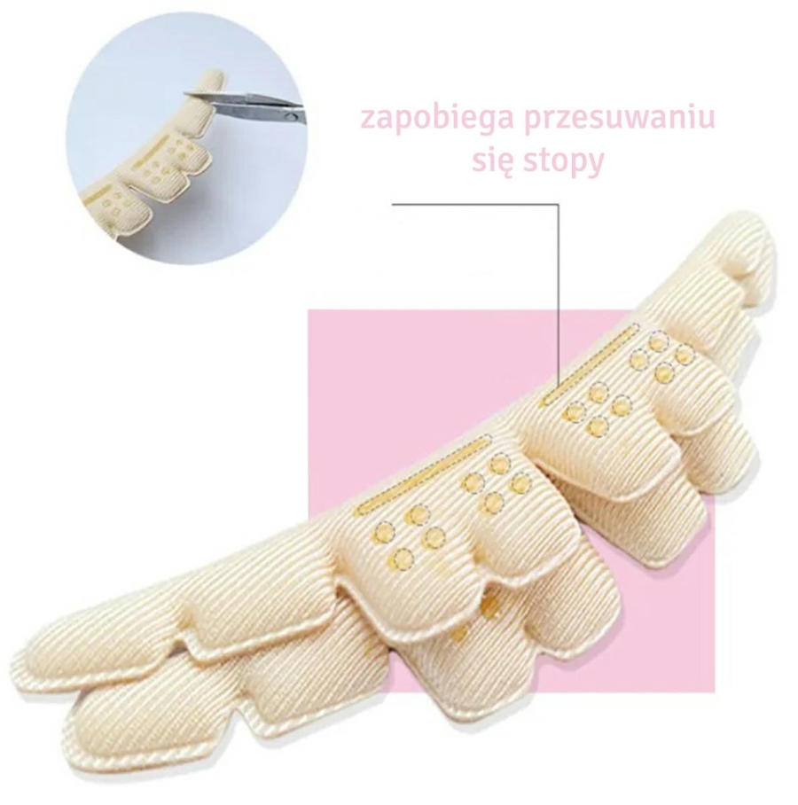 - Zapobiegają ślizganiu się stopy podczas chodzenia na wysokich obcasach i utrzymują ją na właściwym miejscu.