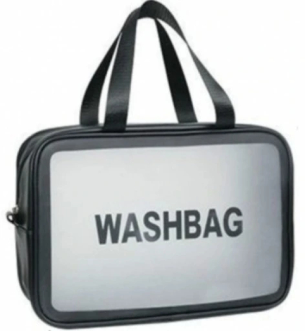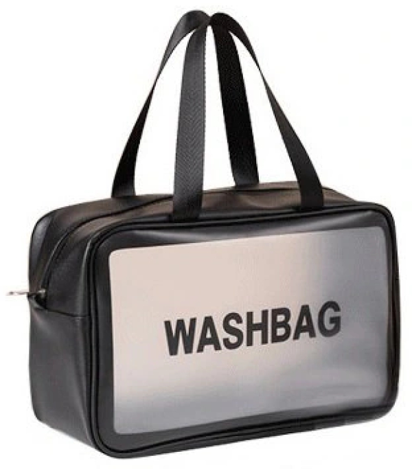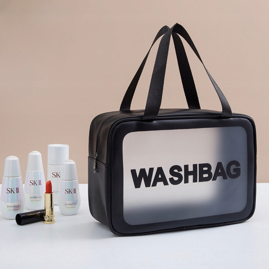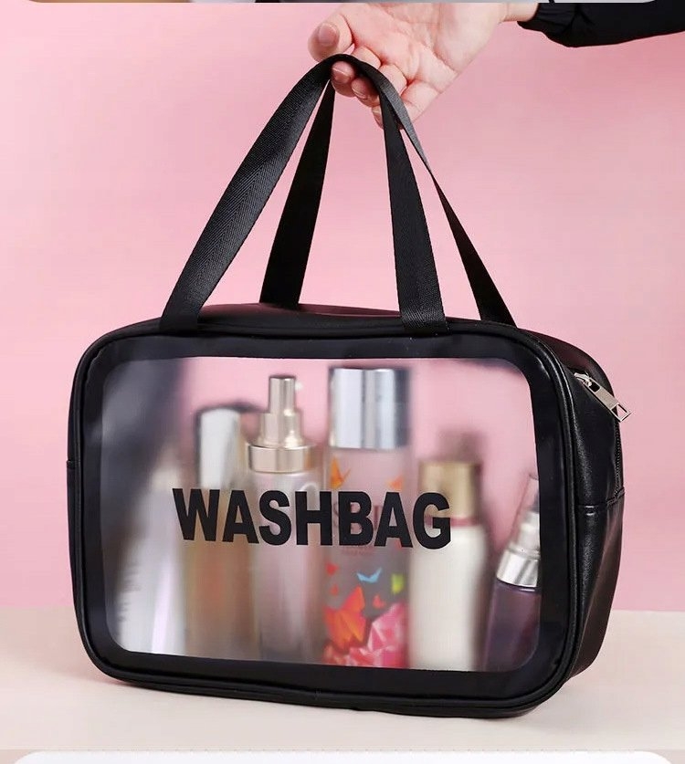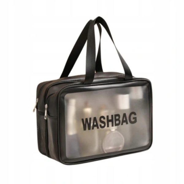 Bardzo praktyczna, organizacyjna, wodoodporna kosmetyczka. Przezroczysta z dwoma uchwytami.