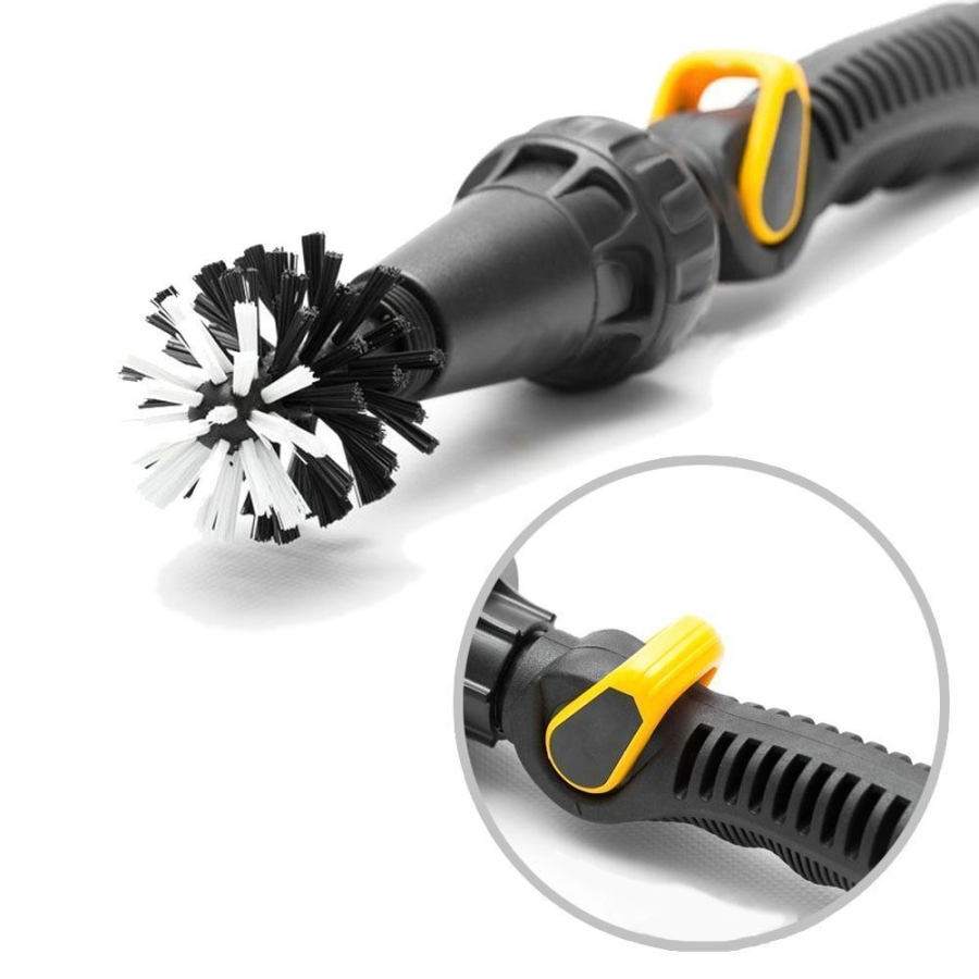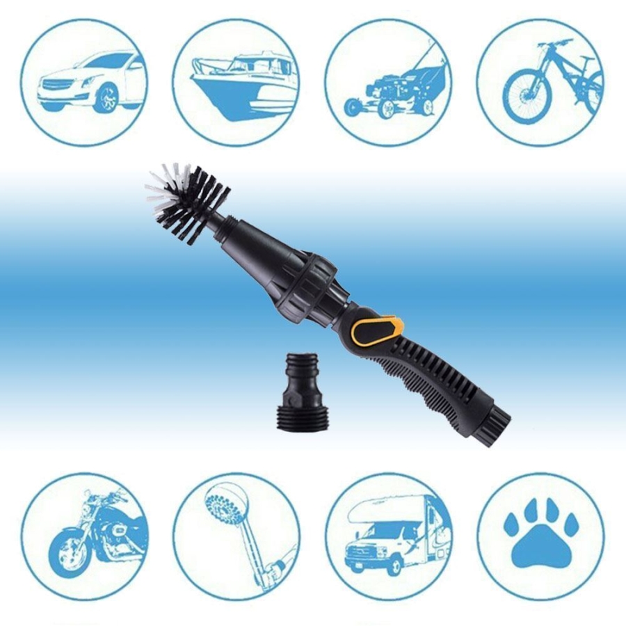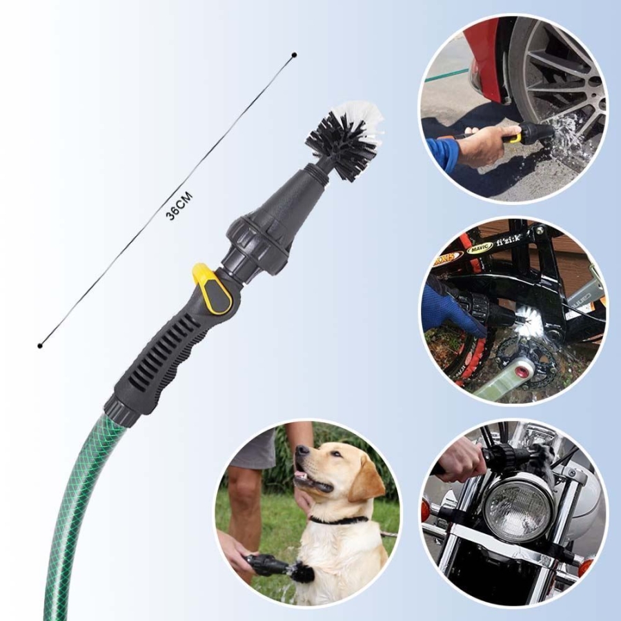Szczotka obrotowa to praktyczny dodatek do każdego garażu lub ogrodu. Szczotkę podłącza się do węża ogrodowego i obraca się dzięki ciśnieniu wody, nie są potrzebne żadne baterie. Z tą szczotką łatwo i wygodnie wyczyścisz nawet trudno dostępne miejsca, takie jak felgi kół samochodowych lub części motocykla. Szczotka doskonale posłuży także do mycia roweru, mebli ogrodowych, kijów golfowych lub turystycznych butów.