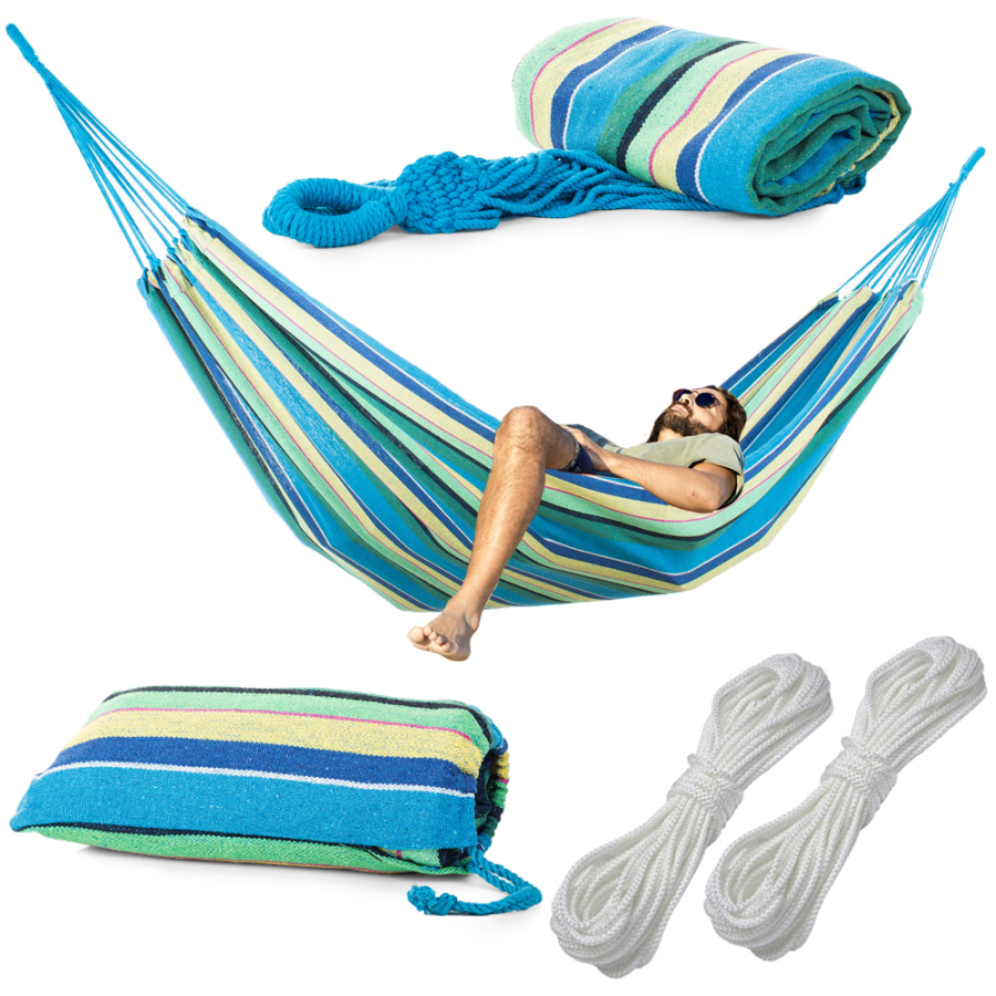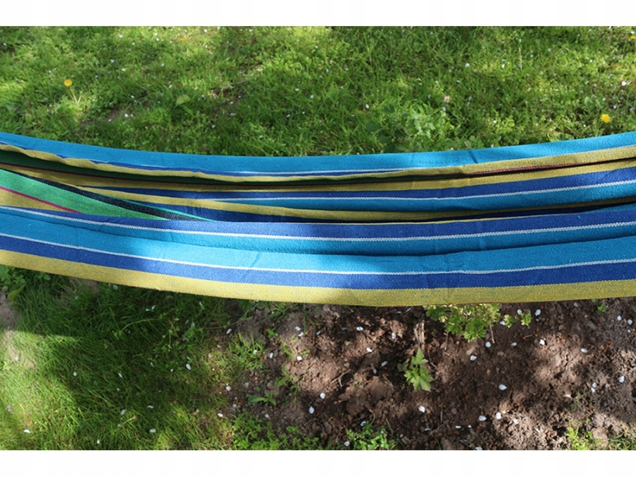Hamak jest idealnym przedmiotem dla każdego, kto lubi spędzać swój wolny czas na łonie natury. Wystarczy przywiązać dwa końce huśtawki do drzew lub mocnych słupków i cieszyć się wygodą. Zestaw zawiera dwie linki, którymi możemy przymocować nasz hamak. Można w nim na przykład czytać książkę, delikatnie kołysząc się w miękkiej huśtawce.