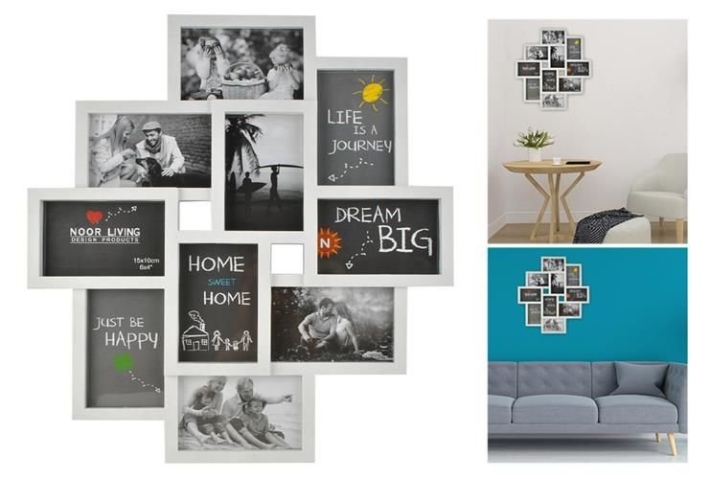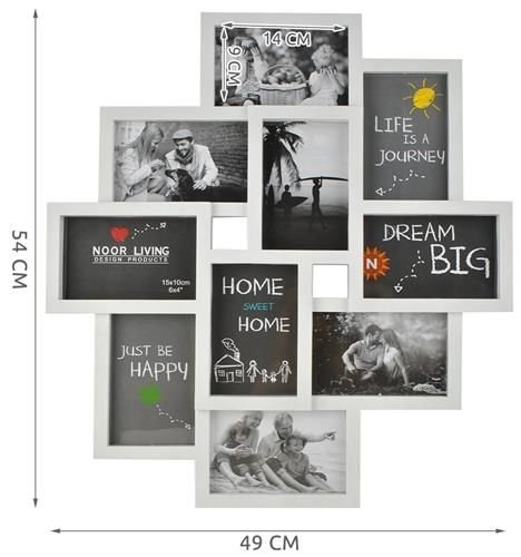 PRAKTYCZNA - do ramki można umieścić aż 10 zdjęć o maksymalnych wymiarach 10x15cm (z zewnątrz widoczny format 9x14cm); dzięki połączonym elementom oszczędzamy w domu miejsce na umieszczanie tradycyjnych 10 ramek; prosty sposób, aby bez wysiłku powiesić kilka obrazków.