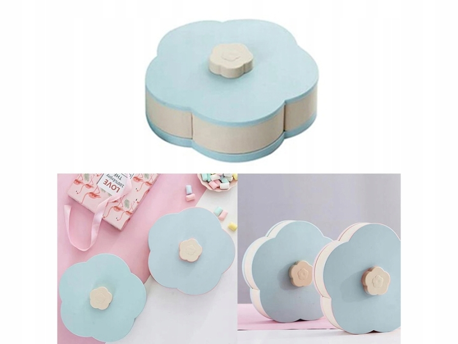Obrotowy kwiatowy box jest dzielony, więc możesz przechowywać różne przekąski, takie jak pestki słonecznika, suszone owoce, orzechy, chipsy, oliwki i inne przekąski.