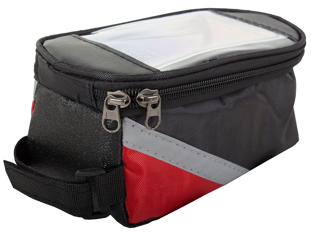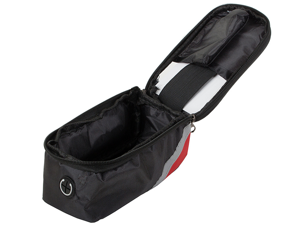Torba wykonana jest z trwałego materiału. Wygodna w użyciu, umożliwia korzystanie ze wszystkich funkcji telefonu podczas jazdy na rowerze. Do ramy roweru przymocowywana jest za pomocą regulowanych pasków na rzep. Mieści urządzenia do maks. 6,8'' Krawędzie są wyposażone w odblaskowy pasek dla zwiększenia bezpieczeństwa na drodze.