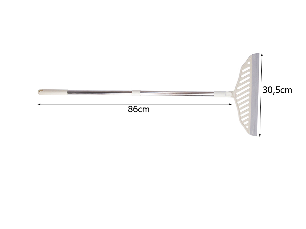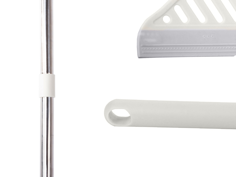Można używać na suchych i mokrych powierzchniach. Łatwo usuwa plamy z wody, włosy i kurz z zakamarków. Solidny drążek, który składa się z dwóch części, łatwo się rozkłada i ściągaczka, którą można obracać o 180 stopni. Idealna do garażu, płytek, szkła, mokrej podłogi, prysznica i wszelkich gładkich powierzchni. Ściągaczka do podłogi łatwo usuwa włosy, wodę, brud itp. Może być używana również jako ściągaczka do okien.