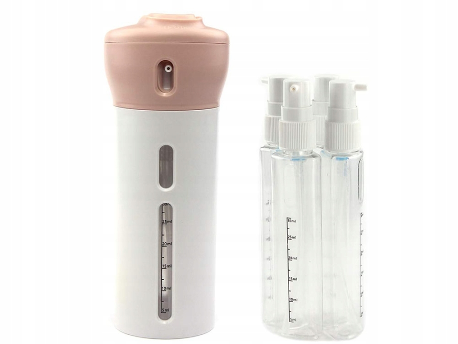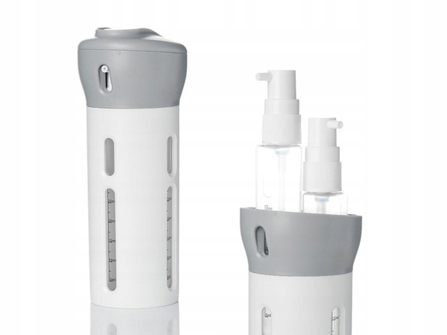 Praktyczny pojemnik podróżny, który sprawdzi się w każdej sytuacji. Dzięki temu zaoszczędzimy wiele miejsca w bagażu. Umożliwia przechowywanie potrzebnej kosmetyki w postaci płynnej. Etui zawiera cztery przezroczyste plastikowe pojemniki z dozownikiem, każdy o pojemności 40 ml (miarka do 30 ml).