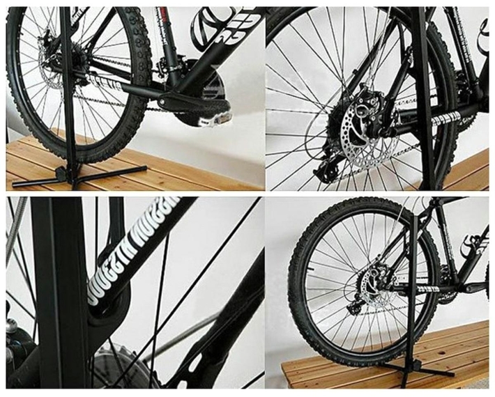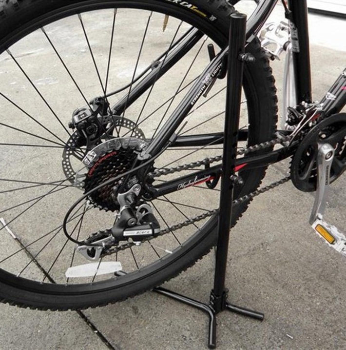 - Rower stojący na takim stojaku może swobodnie „kręcić”, więc można na nim ustawić tylną i przednią przerzutkę oraz hamulec.