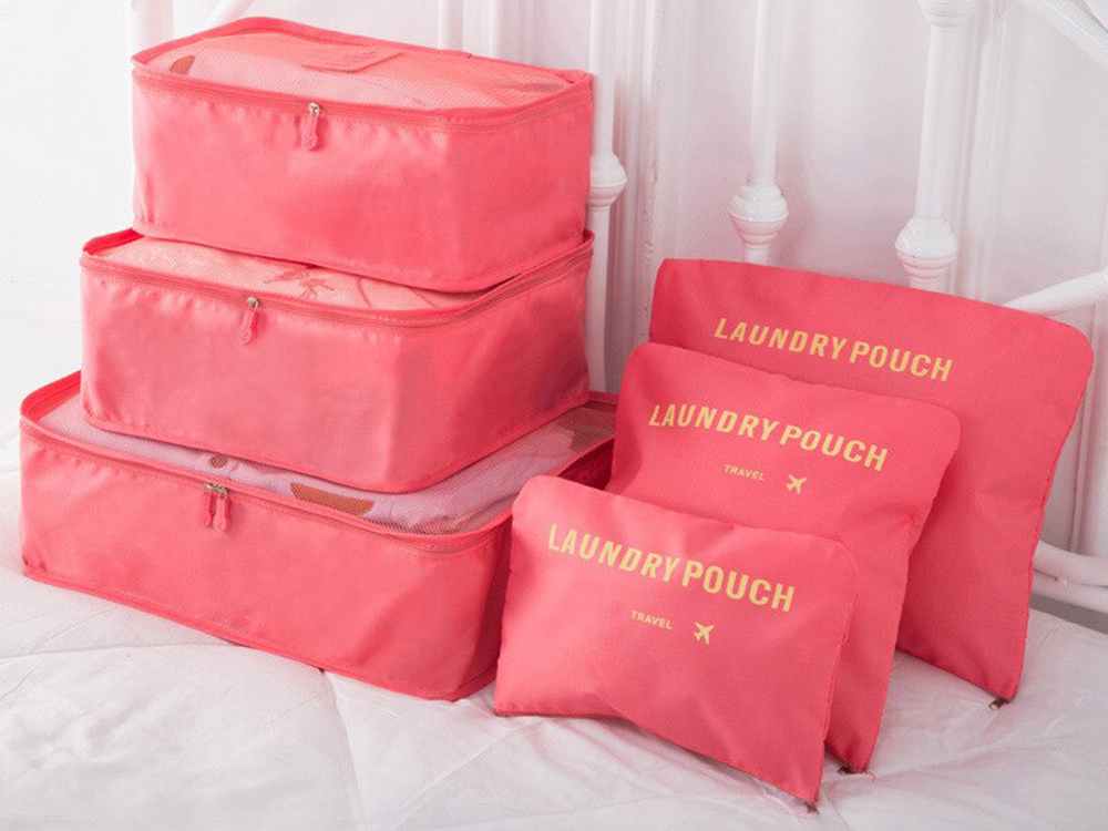 Zestaw sześciu organizerów podróżnych, które świetnie nadają się do spakowania wszystkich niezbędnych rzeczy, takich jak bielizna, buty, ubrania czy kosmetyki oraz do przechowywania prania.