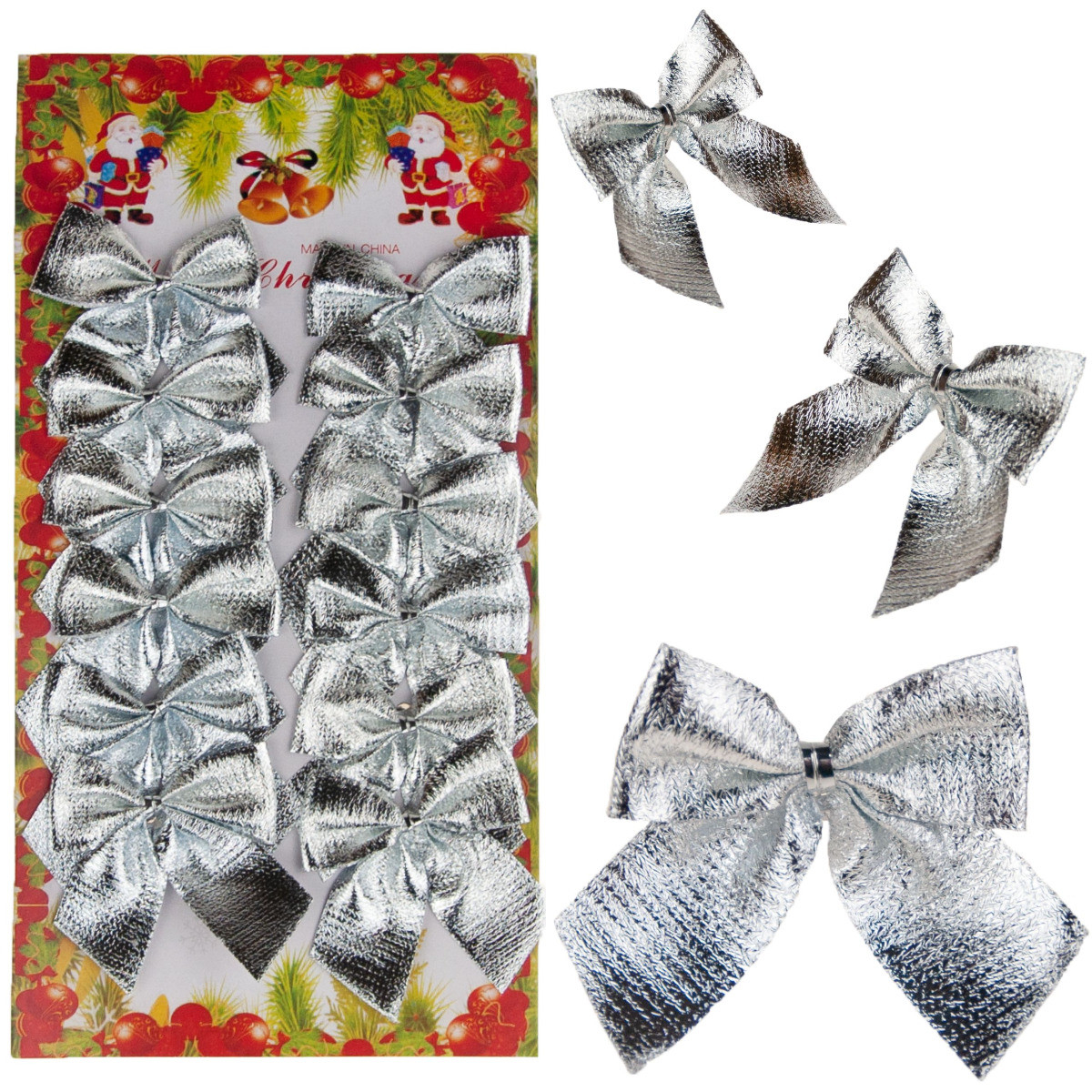Srebrne świąteczne kokardki z pięknym błyszczącym efektem są wspaniałym dodatkiem do dekoracji świątecznej. Można je użyć na wiele sposobów – jako dekorację choinkową, do prezentów, wieńców, girland lub ozdobienia balustrad i roślin.