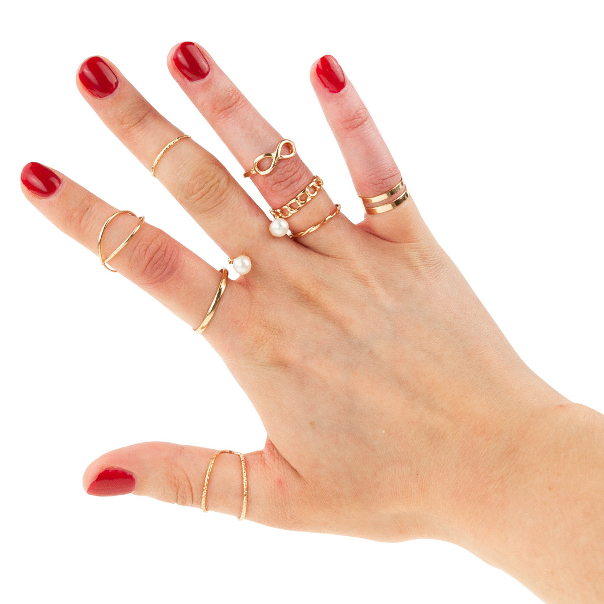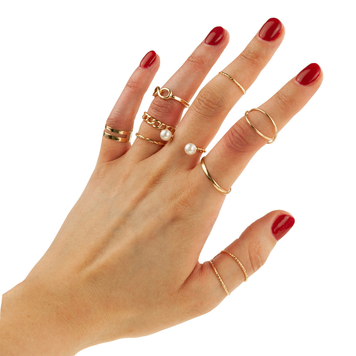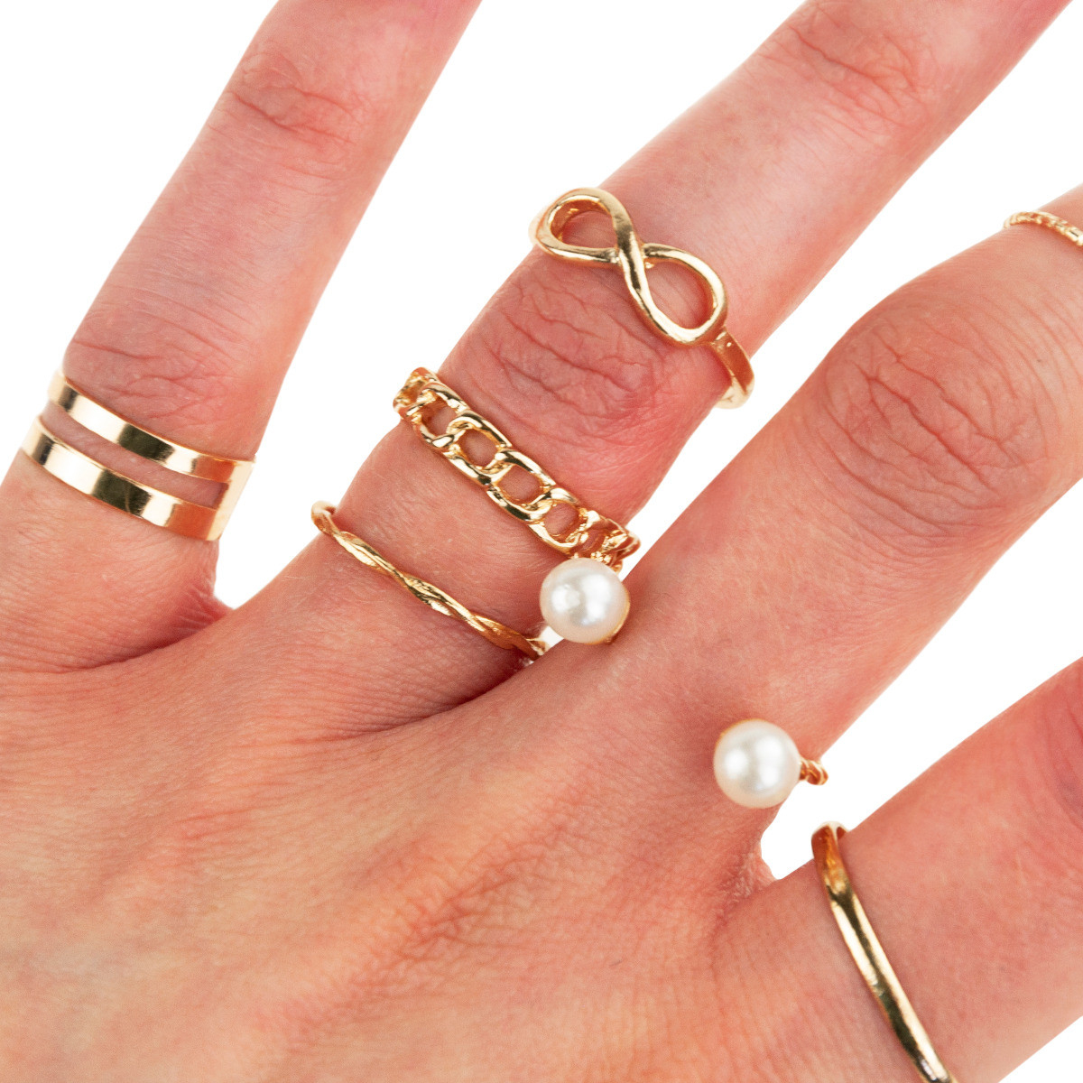 Zestaw zawiera różne pierścionki i obrączki ozdobione syntetycznymi perłami. Jest to zestaw złotych pierścionków, które możesz nosić na wszystkich palcach dłoni.